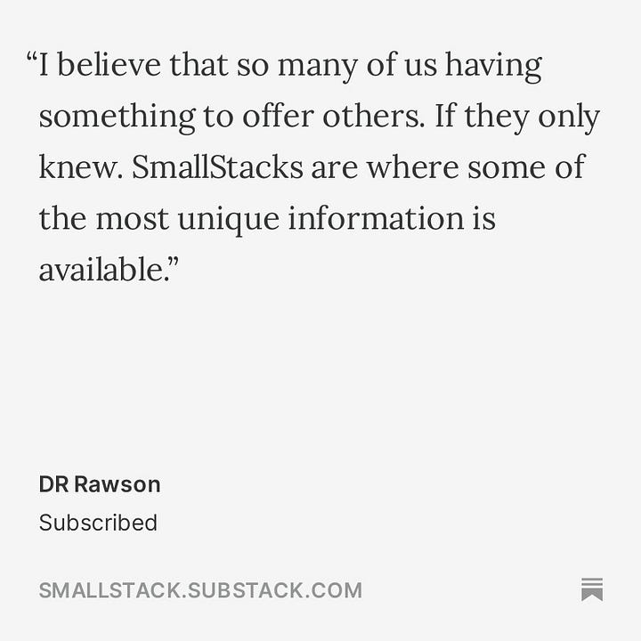 But first, here’s a reminder to subscribe to SmallStack! If you’re a visitor here, we hope you decide to subscribe and come back often to find some of the best content that substack has to offer. SmallStack highlights the smaller publications and gives them a voice in this big, big world. Our Library is open to any publication on substack with fewer than 1,000 subscribers, and we will be showcasing our smallest publications—those with fewer than 500 subscribers—through Featured Posts. Both of these projects will go live in September.