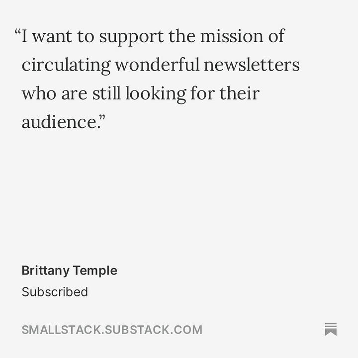 This is hard to believe, but SmallStack only just started on May 15th of this year. We passed our two-month birthday earlier this week, and I’m still surprised at just how much we’ve grown in that short amount of time. For those of you who have been with us from the start, your likes, comments, and shares have powered us into a lot of places where small creators can find us. But there are still plenty more who don’t know we are here, so share us widely with your subscribers, your friends, your writing groups, and anyone looking to find a community of small publications.