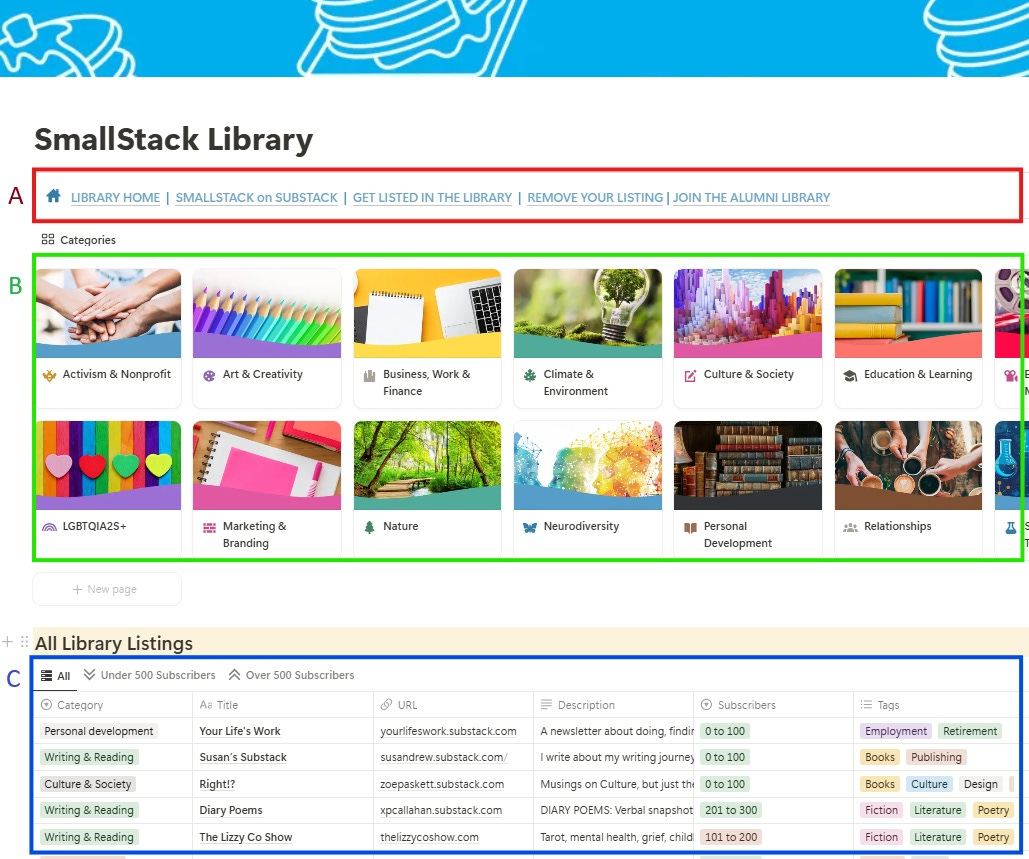 The SmallStack Library is hosted on a Notion website. Below is a pair of screenshots of the Library home page with three labeled parts: A, B, and C.